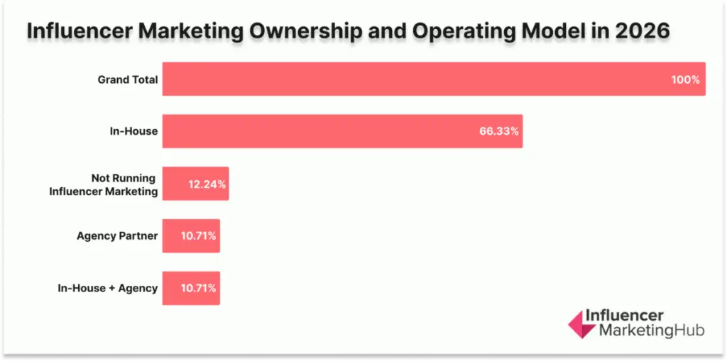 The 2026 data shows influencer marketing is being run as an internally owned growth function far more often than an outsourced service. 66.33% of respondents say their influencer marketing is managed entirely in-house.