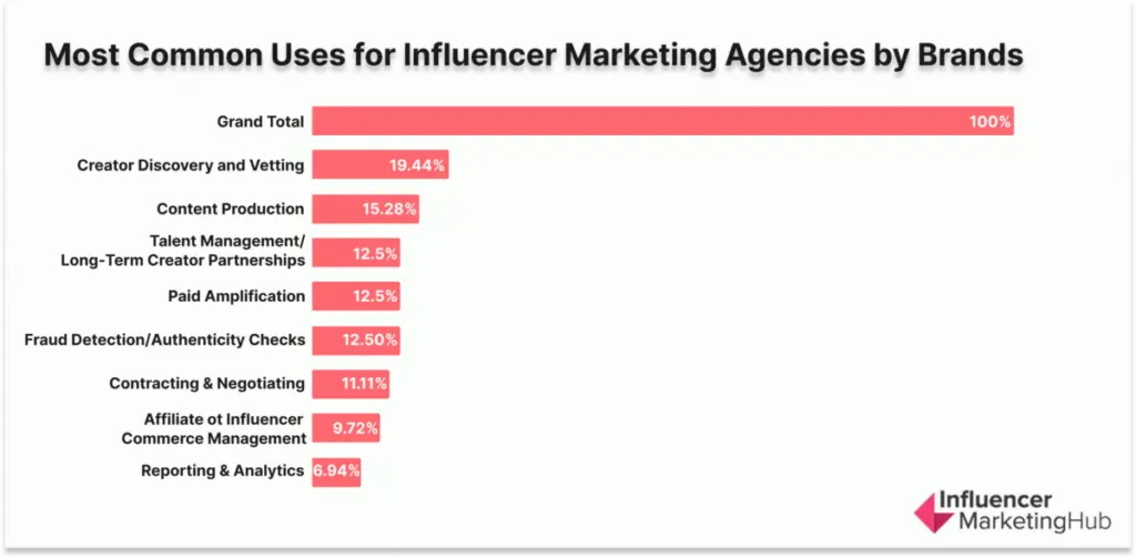Creator discovery/vetting being the top outsourced function (19.44%) suggests agencies are still valued for creator networks, speed, and screening capacity—especially as brands expand nano/micro and UGC-style volume where sourcing becomes a production line.
