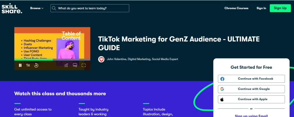 This Skillshare course by John Valentine teaches you how to utilize TikTok to market towards a Gen Z target audience. It goes over all things necessary to maximize brand awareness, marketing, and audience reach, including hashtags, challenges, social media trends, using FOMO, applying influencer marketing, and using third-party applications.