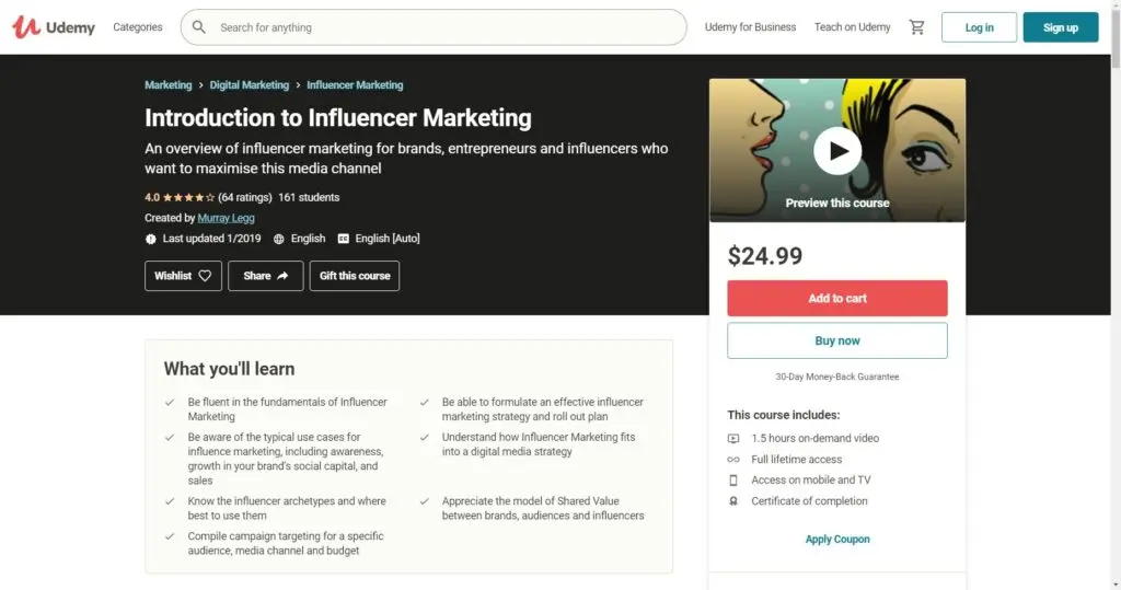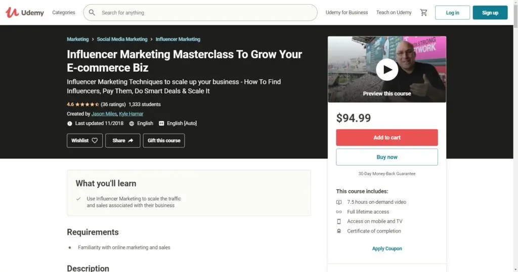 This influencer marketing course was created by Jason Miles and Kyle Hamar and is offered through Udemy. It includes 7.5 hours of on-demand video and a certificate of completion. The course teaches you how to scale your traffic and sales through influencer marketing.