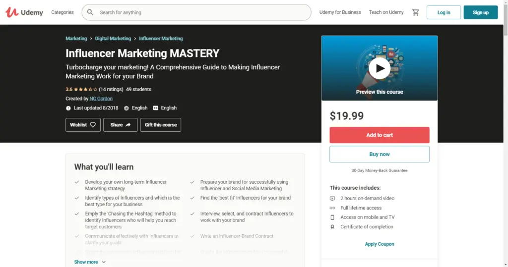 Next on our list of influencer marketing courses, we have a course offered through Udemy and created by NG Gordon. The course includes 2 hours of on-demand video and a certificate of completion. In this course, you'll learn how to create your own long-term influencer marketing strategy, finding the best influencers for your brand, how to build a successful influencer marketing campaign, and how to measure your influencer marketing KPIs.
