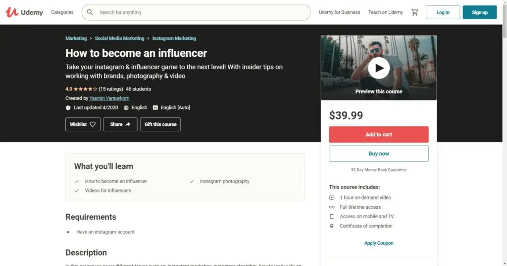 In this influencer marketing course created by Yasmin Vantuykom, you'll get 1 hour of on-demand video and a certification of completion. The course offers details about how to become an influencer, photography for Instagram, and video production, among other things. The course is for anyone interested in creating content for Instagram and becoming an Instagram influencer.
