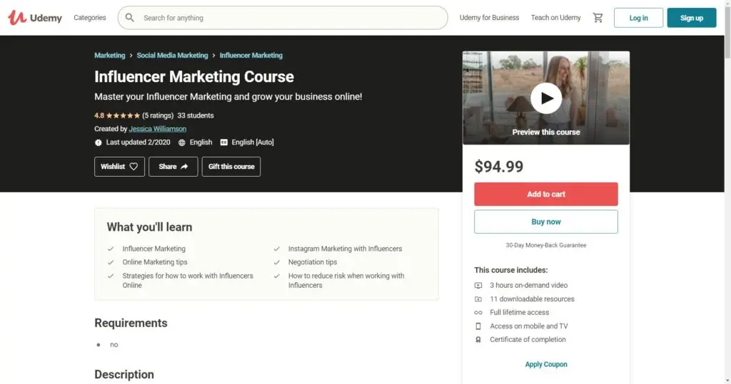Udemy has a lot of influencer marketing courses on offer, and this one created by Jessica Williamson is great for both beginner and advanced influencer marketing professionals. It includes 3 hours of on-demand video, 11 downloadable resources, and a certificate of completion. You'll learn online marketing tips, reducing risk when working with influencers, and more.