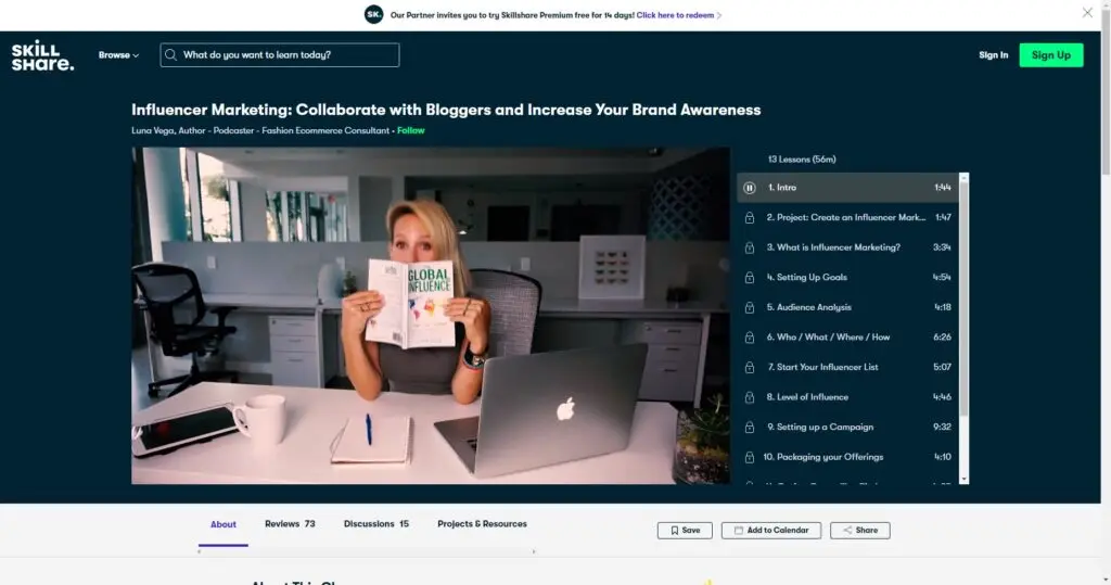 We're rounding out our list of the best influencer marketing courses with one last offering through Skillshare. In this 1-hour course created by Luna Vega, you'll learn how to find the right influencer to work with as well as how to approach them to inspire them to say yes. If you're a business owner, freelancer, or new marketer who wants to increase your reach, this might be a good fit for you.