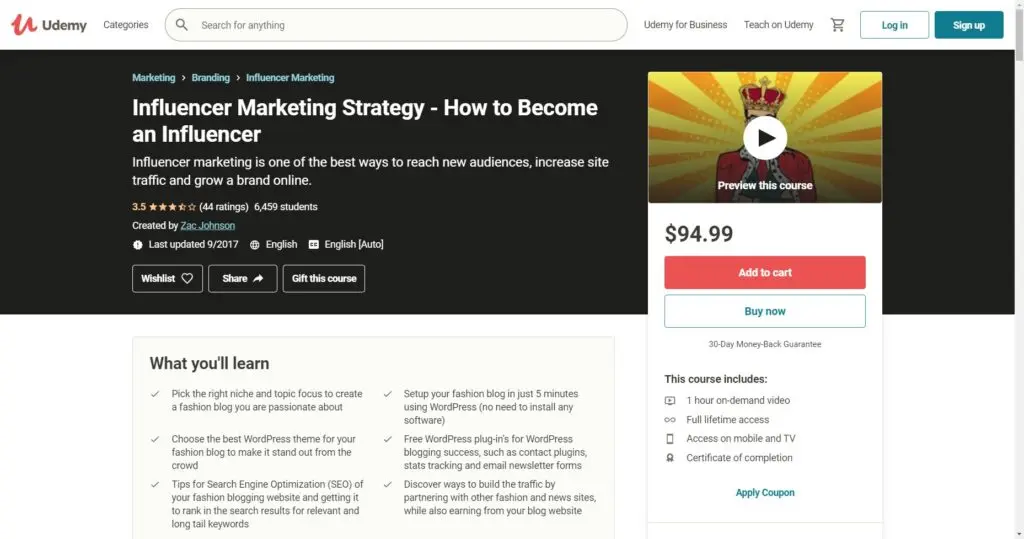 In this course by Zac Johnson and offered through Udemy, you'll get 1-hour of on-demand video and a certificate of completion. The course is designed to help you reach new audiences, increase site traffic, and grow your brand. You'll learn how to start your own fashion blog, including how to pick the right niche, get set up on WordPress, optimize your content, and find ways to build traffic.
