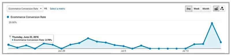 All the insights above can be gathered from Google Analytics. For example, the screenshot below shows conversion rates over a one-month period. Each spike in conversions in the chart below was the result of an influencer giving away a product, offering a discount code to their audience, or mentioning the brand in a post.