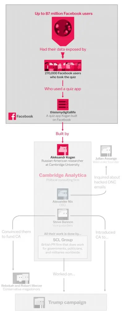 Aleksandr Kogan, a Russian-American researcher at Cambridge University, built a Facebook app that was a quiz. It collected data from the people who took the quiz, and it also received raw data from their Facebook friends, thanks to a loophole in Facebook’s API.