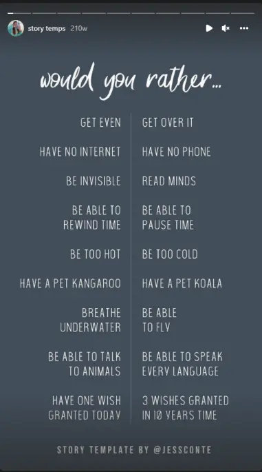 Jess Conte (@jess) shares her Instagram Story Game templates for businesses, influencers, and creators on the platform to use. Below is her sample template for a game of Would You Rather.