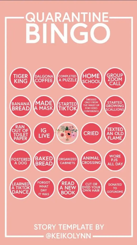 Keiko Lynn (@keikolynn) created a simple, relatable Bingo card using activities that anyone might have tried during quarantine. This also gives the added bonus of making her followers feel accomplished about themselves if they’re able to mark off several items.