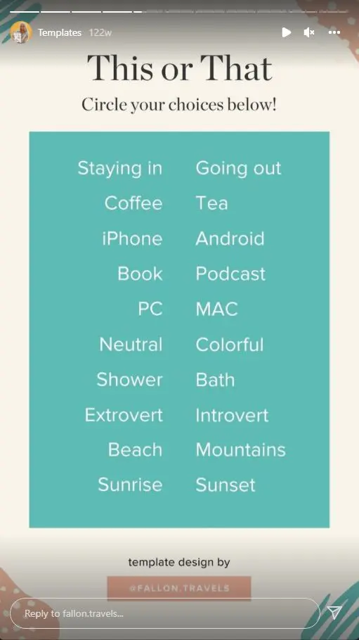 Bali-based Canva design expert Fallon (@fallon.travels) shares various templates on her Instagram Stories and Story Highlights. Below, she shares a minimalist template for a game of This and That. It is simple and intuitive enough to encourage her followers and other Instagram users to participate in the game, or utilize the template.