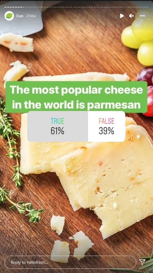 Meal-kit company Hello Fresh (@hellofresh) keeps their followers engaged with a series of true or false questions, such as the example below. They test the audience’s general knowledge on the various food items.