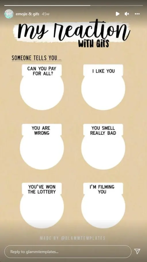 A template similar to @glammtemplates’ work convinces your followers to express their reactions in various situations through the most random or iconic GIFs. Just note it’s important to keep your challenge template easy for everyone to understand.