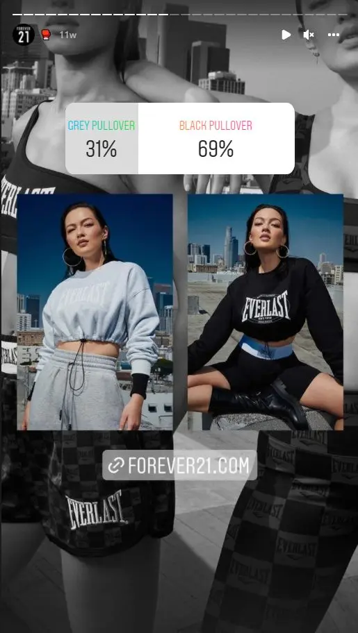 When fashion brand Forever 21 (@forever21) drops a new line of ladies’ wear, they gauge their followers’ preferences for their latest release by incorporating a poll for followers to vote for their preferred item. Although the two items are both pullovers with identical designs, it is evident that availability of colors and the buyers’ color preference can affect sales.