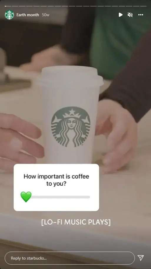 In the Stories of coffee chain giant Starbucks, they cleverly use a green-colored heart emoji slider for followers to rate the importance of coffee in their lives. Starbucks warms up their audience with an emoji slider as they delve deeper into the brand’s advocacy for sustainable consumption of coffee.