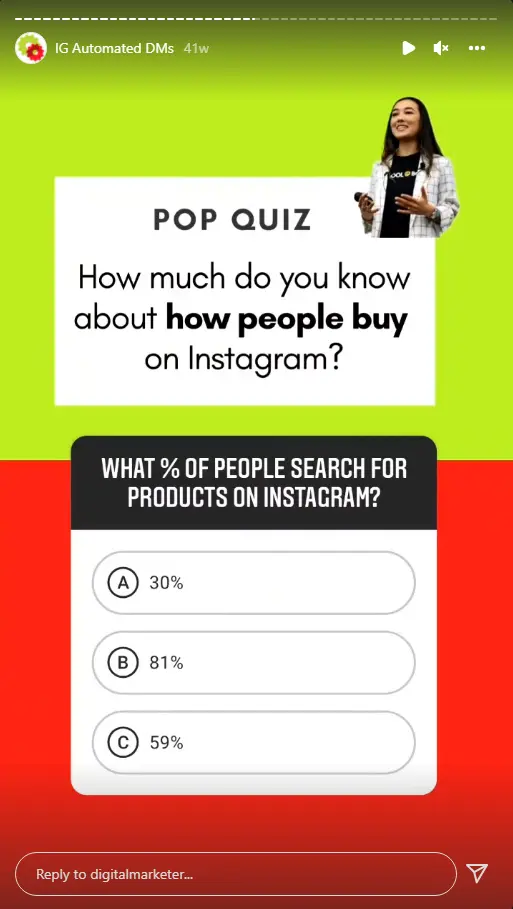 Business experts over at Digital Marketer (@digitalmarketer) test their followers’ knowledge on digital marketing with pop quizzes. In the example below, they quiz the audience on the percentage of people using Instagram to search for new products. The answer: 81% of the 1 billion users of Instagram search the platform for products.