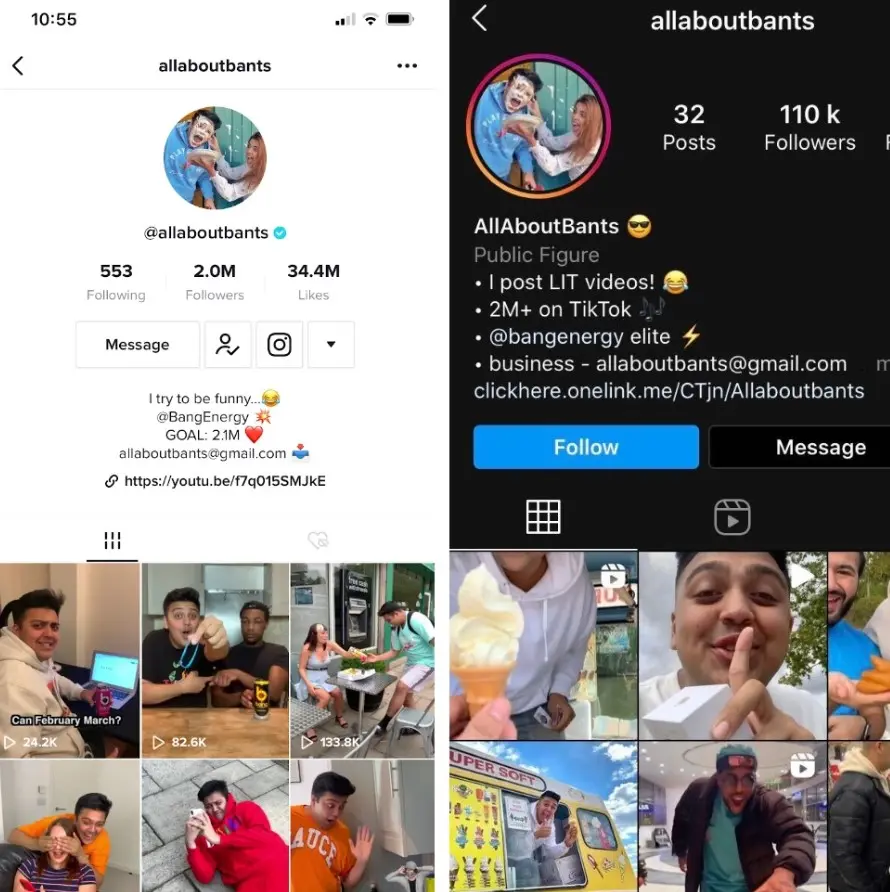 If we take the example of Allaboutbants, an influencer who has a strong following on both TikTok and Instagram, we can see how engagement for the exact same videos differ on both platforms. Allaboutbants has a strong TikTok presence of 2 million followers. His average views are around 80K on TikTok, with likes of around 20K and averaging 100 comments on his posts. On Instagram, however, Allaboutbants only has 110K followers but brings in 100K views, 3K likes and averages 50 comments on his IG Reels posts.