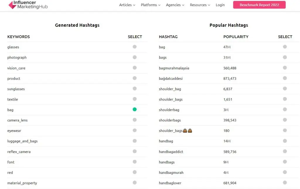 Alternatively, you can also use the free Hashtag Generator Tool from Influencer Marketing Hub. This allows you to generate relevant hashtags based on the content of the image. After you upload your photo, the tool will generate a few keywords relevant to the content.