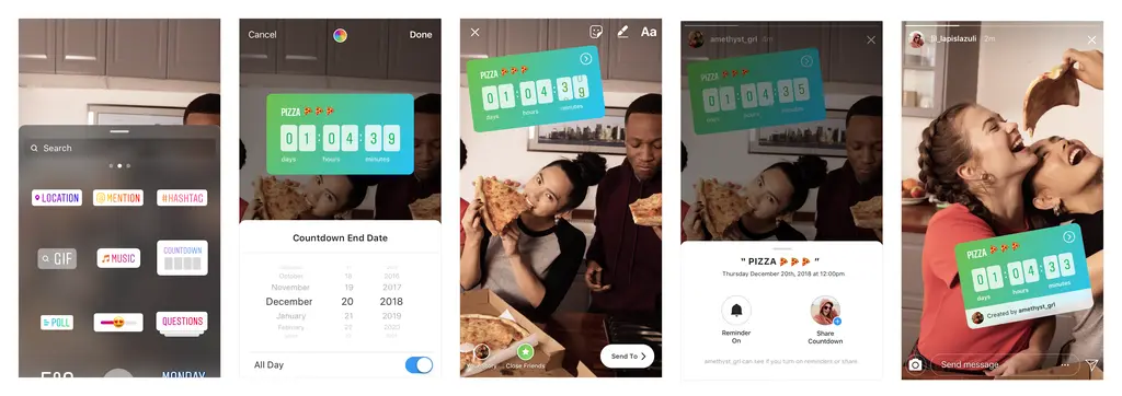 Instagram introduced a new interactive countdown sticker in Instagram Stories at the end of 2018. You can build excitement with friends while you count down to any upcoming moment. You add a Countdown Sticker to your Story by selecting it from the sticker tray after taking a photo or video. Name your countdown, add an end date or time, and customize the color before sharing to your Story. After you've created a countdown, it will be available in your sticker tray to reuse in new stories until the countdown ends. Anyone who follows or shares your countdown receives a notification when the countdown ends.