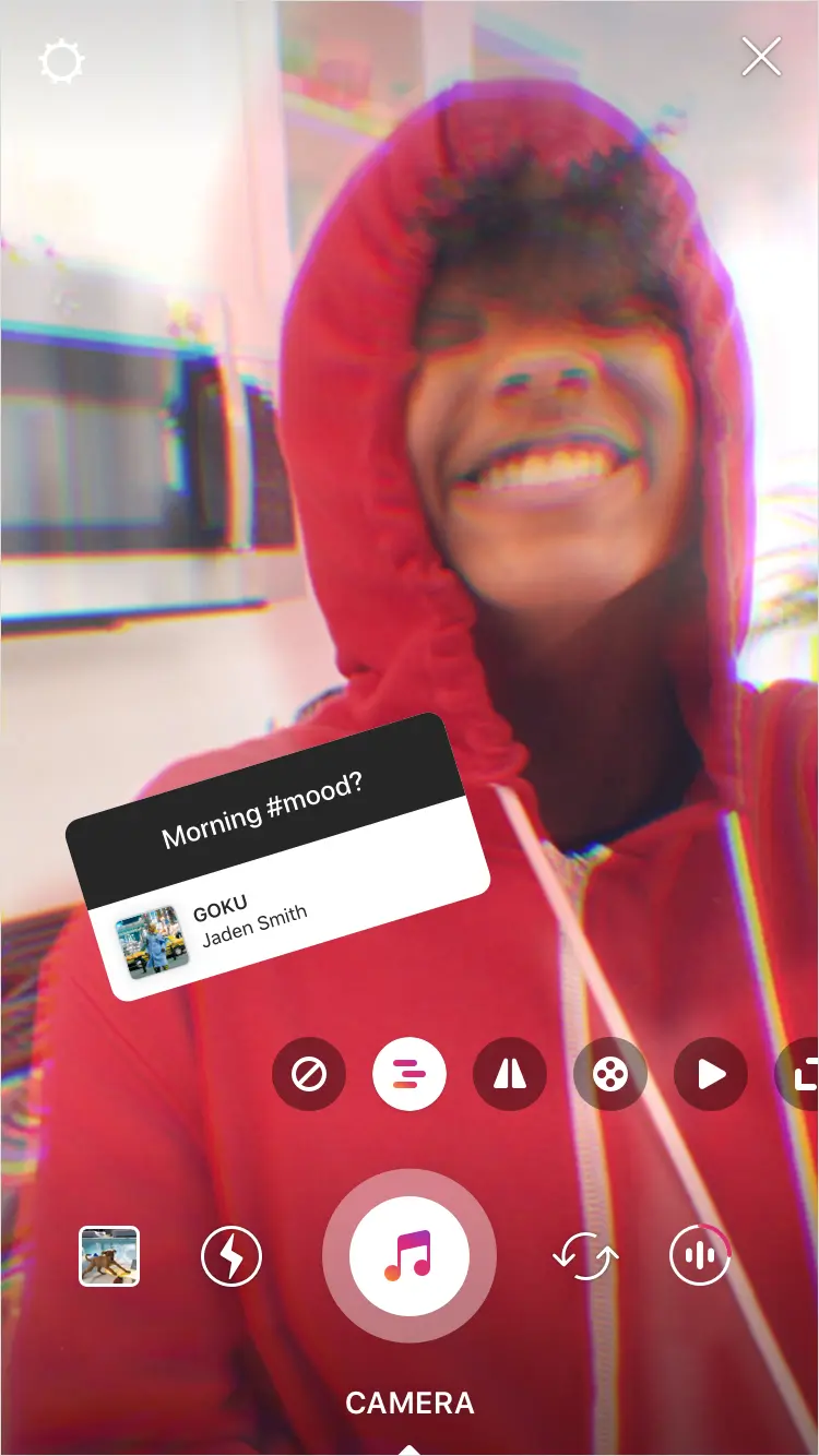 You see the music icon when you use the questions sticker. When your friends respond, they can choose a song directly from the music library to share with you. Open the viewer’s list to see all their responses, and tap the play button to listen to the songs. When you share your favorites to your Story, you can capture a photo or video as the music plays in the background. You can also see new effects in the camera that react with the beats and sounds of a song.