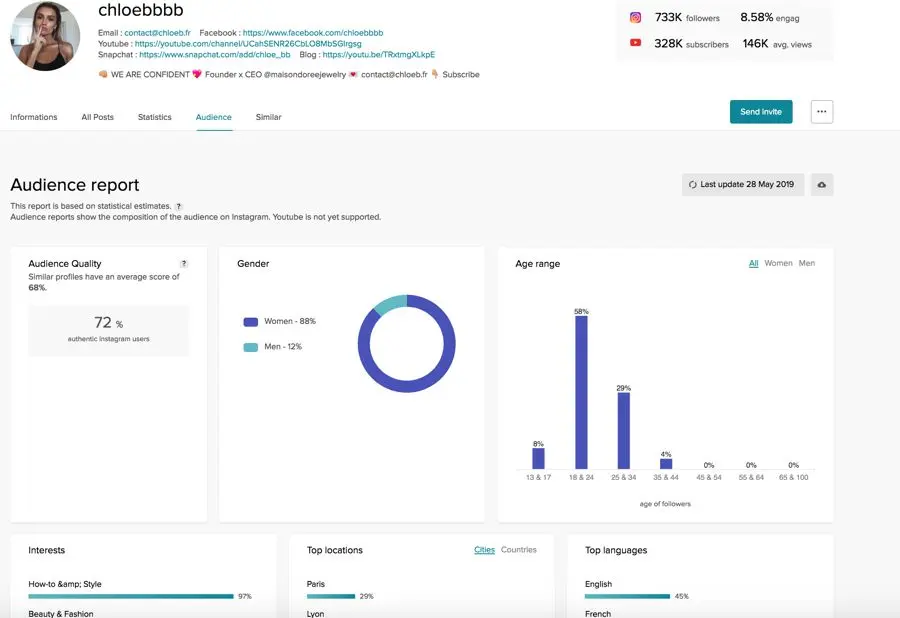 You’ll get a nice amount of data on each influencer if you want to look at them further. You can see their big stats like reach, average engagement, average likes and comments, as well as minimums and maximums for each. You’ll see the accounts they mention most and the accounts who are mentioning them—good for finding out if they’ve collaborated with other brands before, as well as a way to find yourself similar/connected influencers. You can’t search by audience data, though, which is a bit of a letdown because that data is there. You just have to run those audience reports to get at it.