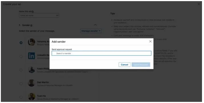 A point to note is that the senders you add should be your first-degree connections on LinkedIn. When you click on “Add sender”, a pop-up appears, where you can search for the sender. When you click the “Send request” button, an approval request is sent to their LinkedIn inbox.