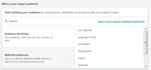 Click on “Matched audiences” to use your data to retarget website visitors. Data sources include Lead gen forms, contact lists, and third-party sources.