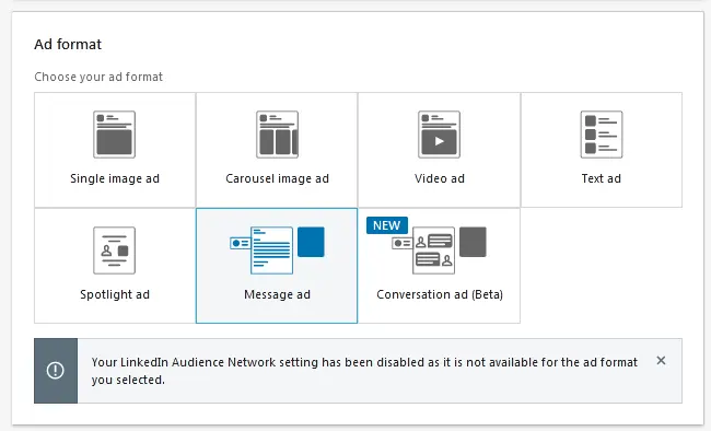 5. Once you have selected your target groups, you reach the “Ad format” section. Select “Message ad” from the given options.