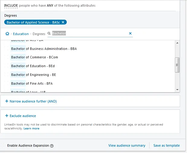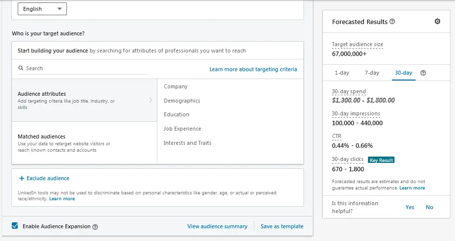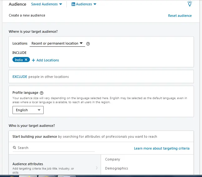 Click on “Audience attributes” to specify targeting criteria, such as company, demographics, education, job experience, and interests and traits.
