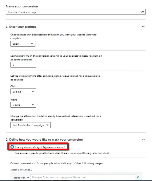 It’s a good idea to select the radio option for “Use my site-wide Insight Tag” since it automatically tracks conversions originating from your campaign, without you adding any event-specific pixels.