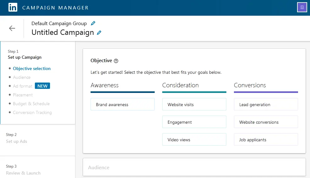3. Specify your ad’s objective. For message ads, select “Website visits” or “Lead generation.” Your ad objective will determine the content to include in your ad and the key metrics to measure your campaign’s performance. For this demo, we have selected “Website visits.”