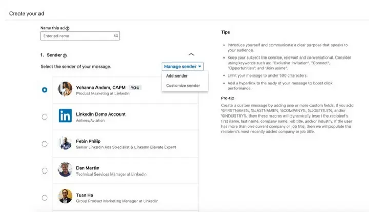 10. You will have to create your ad now. Specify your ad name and sender. If you’ve approved any senders before, their names will appear on this page. You can select a sender from here or add a new sender.