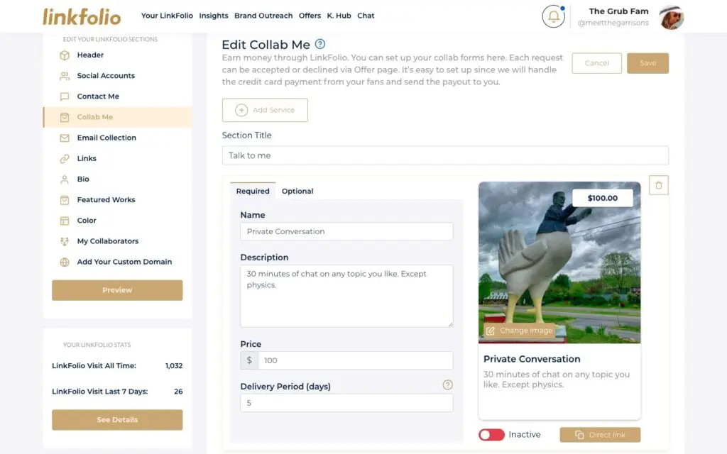 Like any other creator tool, the ability to monetize your personal brand is steeped more heavily in your ability to market yourself than it is in any software tool. That said, LinkFolio’s tools provide perhaps the most direct route from Popularityville to Cashtown than any other competing tool available. From the ability to directly contact brands for a pitch to the Collab Me feature, you’re able to work both sides of the influencer equation—and brands, and your audience.