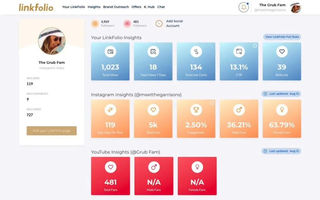 - Premium, $10/month or $99/yearly - All of the above for 5 social accounts, plus: fan counts and channel insights updated weekly, 10 LinkFolio theme colors to pick from, a full analytics suite, outreach to 15 brand contacts per month + a look at influencer campaigns they’ve launched and the CollabMe feature which allows you to offer services straight to your audience from your LinkFolio. On top of all that you’ll get full brand insights, priority access to new brands, 100 top US Instagram brands report updated every month with access to 18 months of historical data.