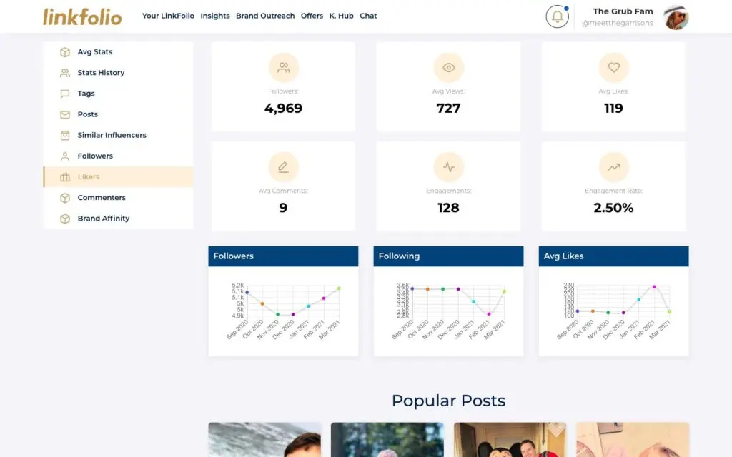 In any case, all subsequent logins bring you right to your dashboard, which gives you quick insights into the performance of your LinkFolio page and social accounts. Scroll further down and you’ll get recommendations on brands you may want to work with and a way to get the right contact info if you want to send out pitches.