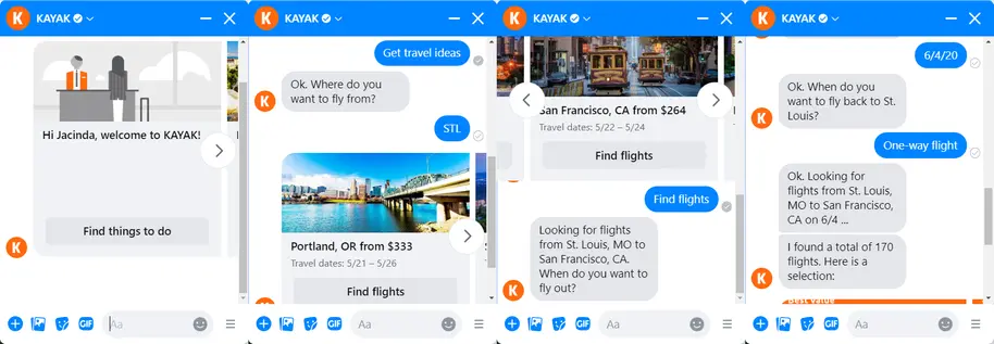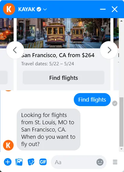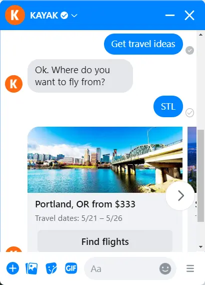 What we love about the Facebook Messenger chatbot from Kayak is that it remembers previous conversations and even uses your Kayak search history for personalization.