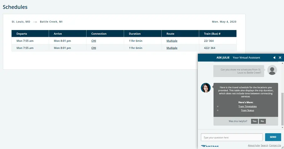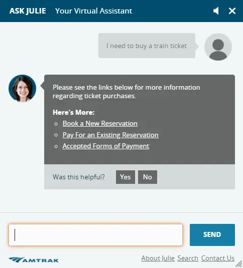 Amtrak's chatbot, Julie, isn't exactly personable, but she gets the job done.