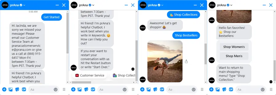 PrAna's chatbot is a great example of conversational commerce. They use a casual, friendly tone and sprinkle in emoji to grab attention and give you the sense that you're talking to more than just a computer.