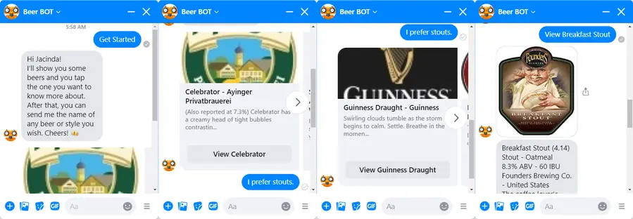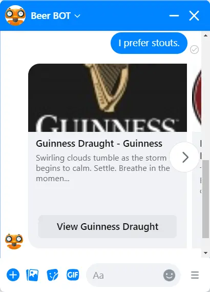 If those aren't what you're after, just let it know the kind of beer you want to know about. We typed in "I prefer stouts." and Beer BOT brought up a selection of stouts for us.