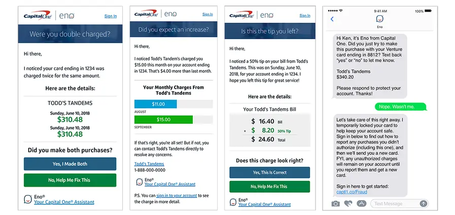 Capital One's chatbot, Eno, is available via web, mobile app, and SMS (text). Eno works in the background constantly, and will proactively reach out to you if it finds something noteworthy like a 150% tip, double charges, or when a recurring transaction is unusually large.