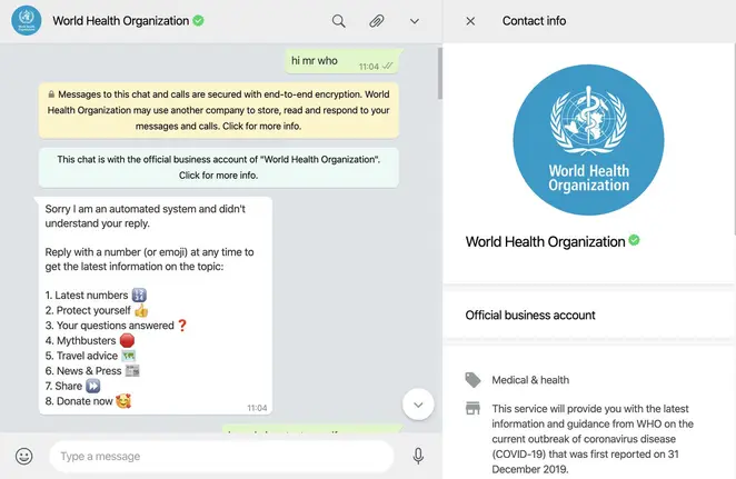 In response to COVID-19, the Word Health Organization launched both a Whatsapp chatbot (seen above) and a Facebook Messenger chatbot to provide users with information about novel coronavirus.