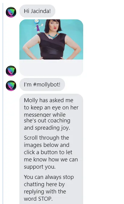 When you start chatting with Mollybot, she lets you know right away that you're talking to a bot and how to interact with it.