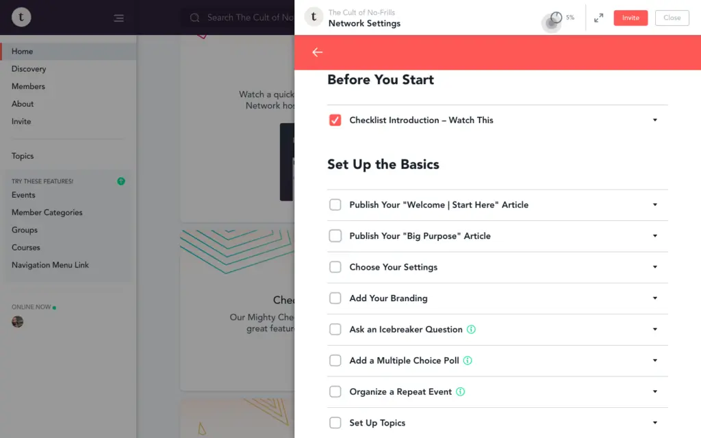 So easy. Logging into Mighty Networks for the first time leaves you with no questions as to how to proceed. You’re presented with a quick video to give you a general idea of what you can do with your new community, and then The Mighty Checklist.