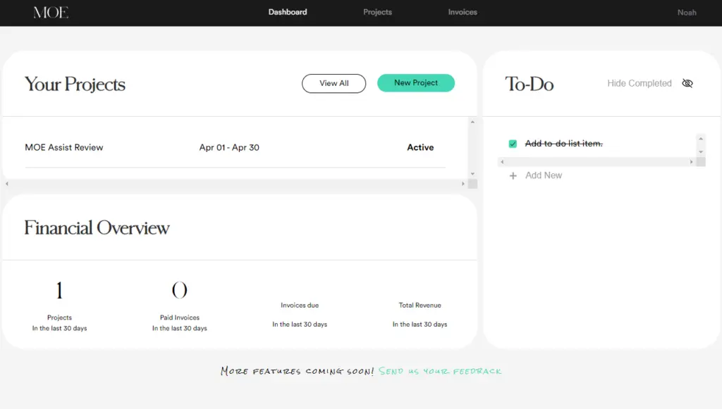 Once in, you’ll see the dashboard. Your dashboard provides an overview of projects, a to-do list, and a financial overview. The financial overview shows a snapshot of your business over the last 30 days. You’ll see the number of projects you’ve worked on, the number of invoices paid, how many invoices are due, and total revenue generated.