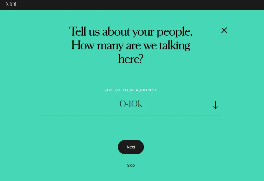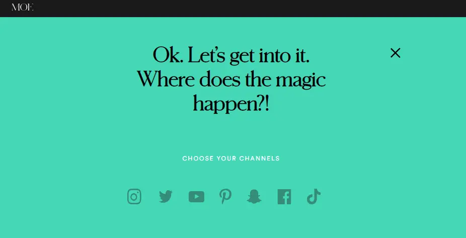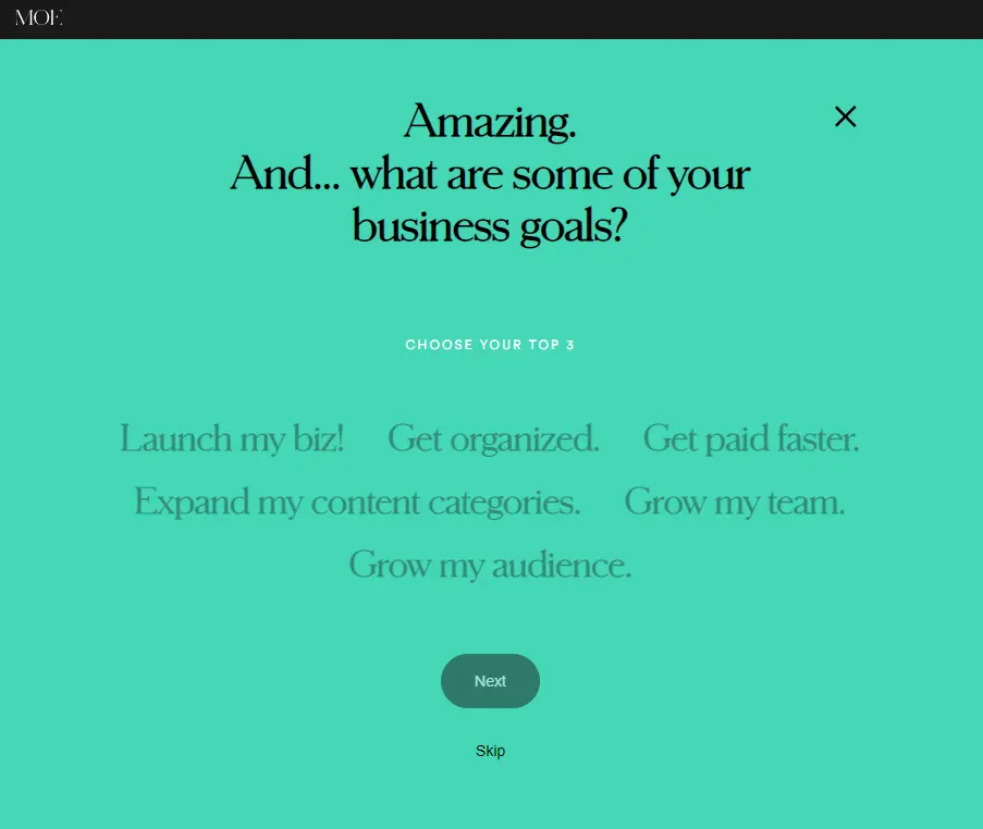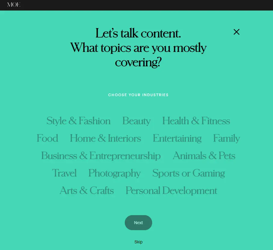 Signup is simple. MOE Assist runs through a quick onboarding process to learn more about who you are. Onboarding covers where you are in your journey as an influencer, which platforms you’re on and what your handles are, what your audience size is, topics you cover, and what your goals are.