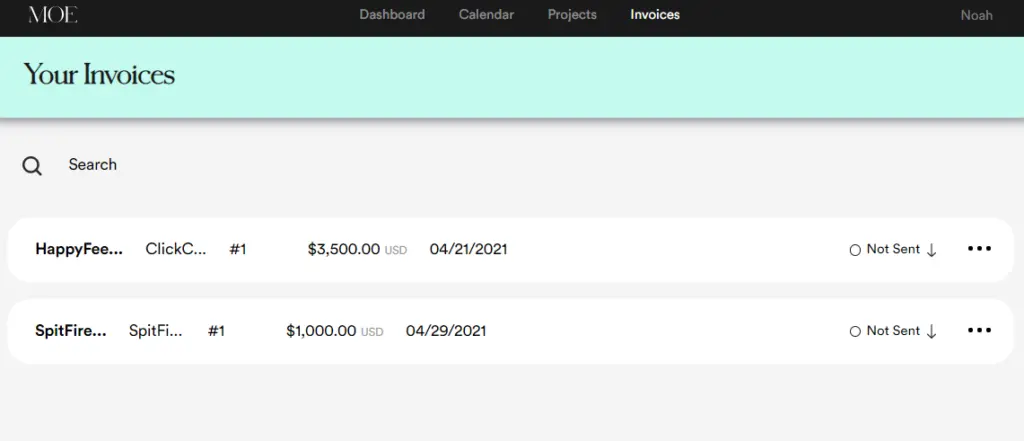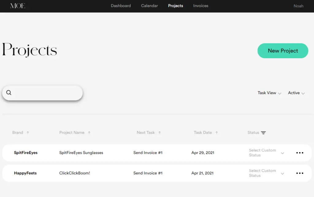 MOE Assist comes with three main pages. These are the dashboard, projects, and invoice pages. On the project page, you can view each by status (contract executed, awaiting contract, ready to post, ready to shoot, and waiting for product).