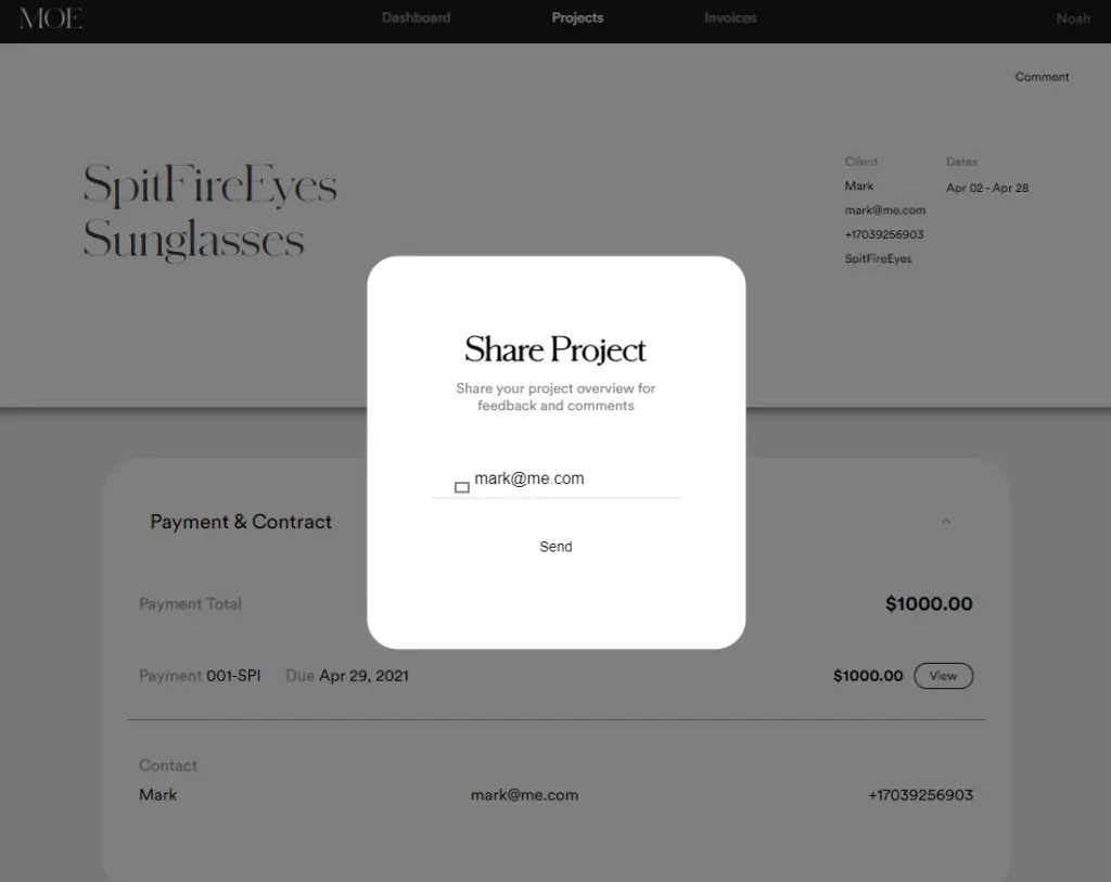 Sharing projects with clients happens via a private link. Once a project is created, click on the share button. A pop-up window will appear showing your contact’s email address and a send button.