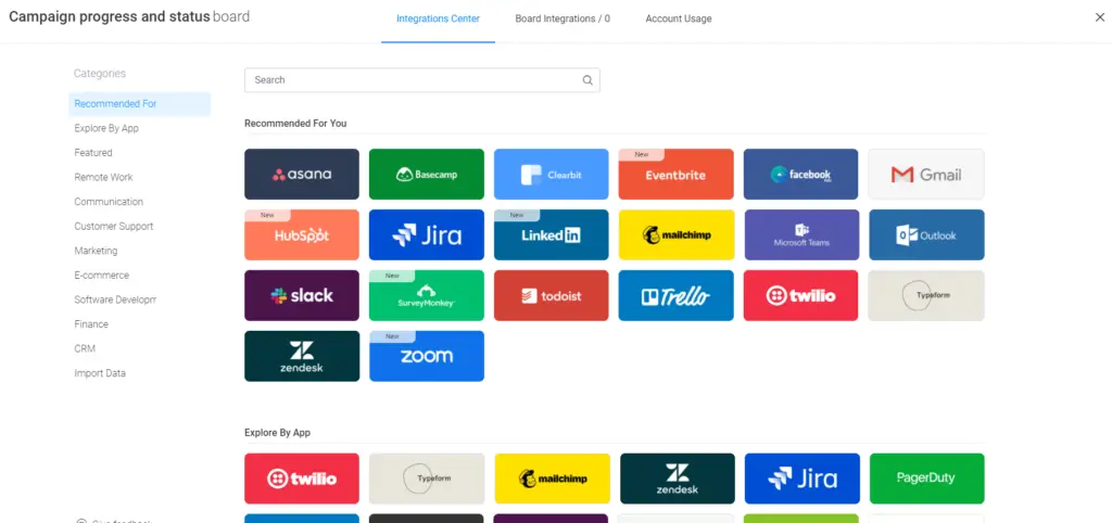 Integrations, however, are where you want your Monday.com board to interact with some other software platform. Again, these come in a variety of categories, including Recommended For You.