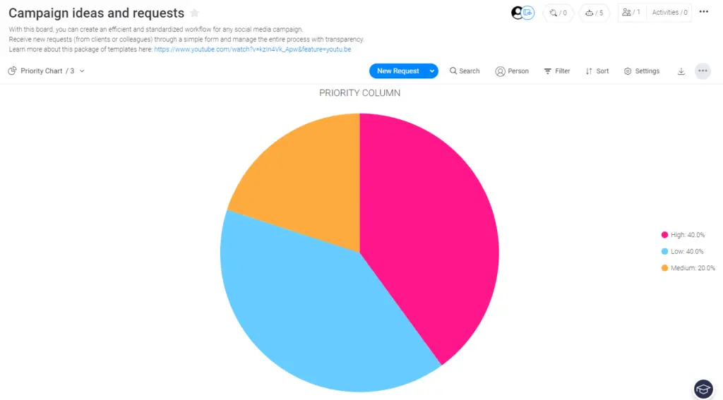 For example, I have clicked on the Priority Chart view in the Campaign Ideas and requests board. As you can see, using the sample data loaded in the templates, the ideas were a mix of high, low, and medium priority.