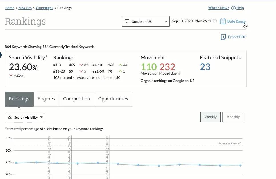 For any and all of these tools, you’re getting a wealth of data that can all be sliced and diced in different ways. Each tool has an overview that summarizes the more precise data underneath. A great feature that assists in the reporting is Moz Pro’s ability to create lists of keywords and links that you want to monitor and get reporting on. While both the Keyword and Link Explorer tools have overview summaries of all keywords you rank for and all links that point to you, creating lists helps you to focus on the ones that matter the most. Maybe you have just 10 keywords that you really want to focus on: by creating a list you can get the metrics for each of them presented as an aggregate, giving you a high level view of how they’re working as a whole. Given that Moz Pro is at its heart an analytics tool, it comes as no surprise that the reporting is so thorough and dynamic.