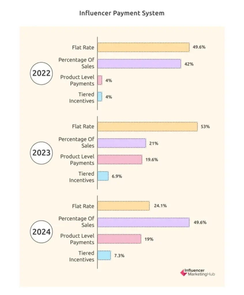 You’ll also want to decide on a compensation model that works for both parties. The latest influencer marketing statistics show that almost 50% of marketers pay influencers a percentage of sales. Flat rate payment (24.1%) is the second most popular payment model, followed by product-level payments (19%) and tiered incentives (7.3%).
